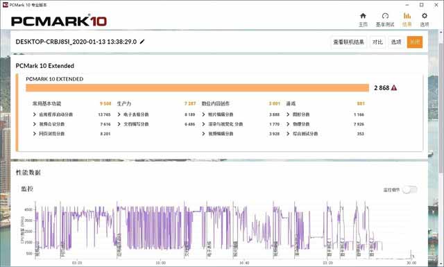 最后是整機性能測試。實測PCMark 10 Extended模式下得分2868,其中常用基本功能為9508、生產力為7287、數位內容創作為3001、游戲為881。從子項得分來看,雷神MixBook Air在生產力方面表現很好,比較適合工作。