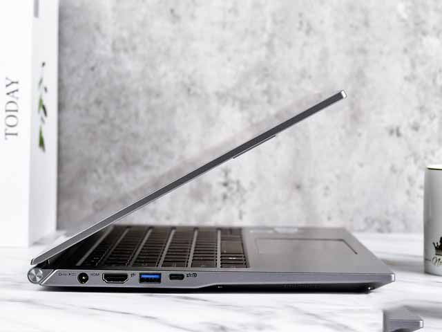 第一次拿到雷神MixBook Air,第一感覺就是輕,而且是非常輕的那種。作為一款14英寸筆記本,雷神MixBook Air的裸機重量只有1.065kg。要知道一般14英寸筆記本重量大約在1.5kg左右,即使13.3英寸筆記本重量也在1.3kg左右,雷神MixBook Air明顯輕太多了。而且最厚處也只有15.9mm,所以雷神MixBook Air給人的感覺就是非常輕薄。