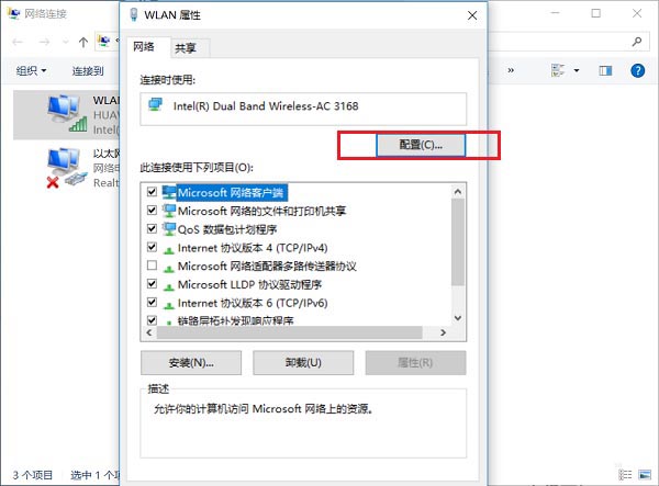 3、進去之后,選中Microsoft網絡客戶端,點擊配置,如下圖所示: