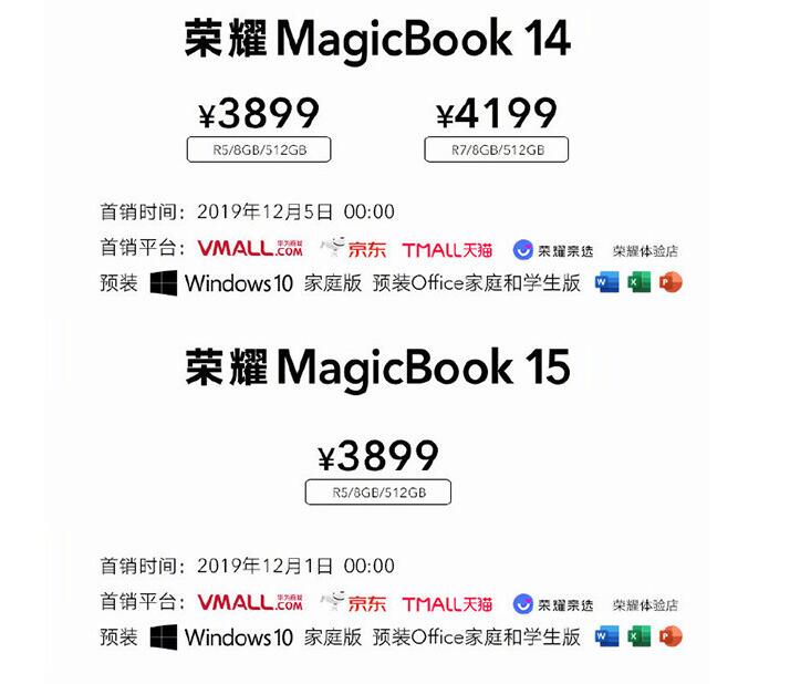 Windows版本榮耀MagicBook 14R5/8GB+512GB版本售價3899元,R7/8GB+512GB售價4199元,榮耀MagicBook 15 R5/8GB+512GB版本售價3899元。