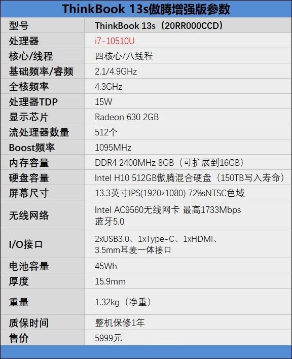 ThinkBook 13s傲騰增強版的機身厚度僅為15.9mm,重量1.32kg,采用了一塊13.3英寸的72%NTSC廣色域屏幕,存儲系統為512GB的intel傲騰混合盤,另外還有一條SO-DIMM插槽可供用戶升級更大容量的內存。