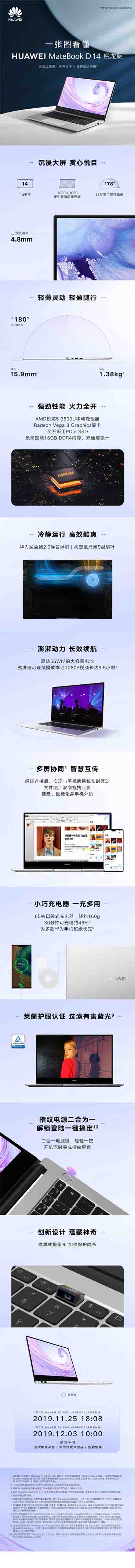 華為MateBook D系列將于11月25日開啟預售,12月3日正式開賣。銳龍版R5 3500U+8GB內存+256GB SSD+1TB HDD預售價3699元;華為MateBook D 14銳龍版R5 3500U+8GB內存+512GB SSD預約價3699元;英特爾版本i5+8GB+256GB SSD+1TB HDD+MX 250售價5299元。