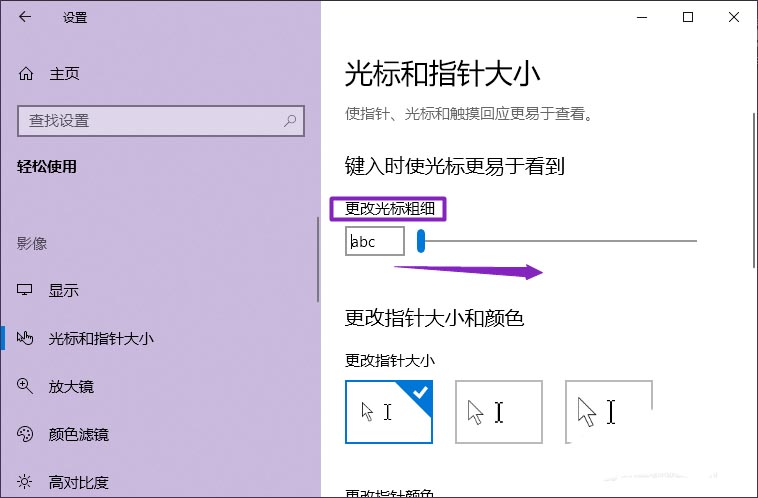 5、然后將更改光標(biāo)粗細的滑動按鈕向右滑動。