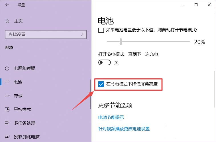 5、將在節(jié)電模式下降低屏幕亮度的勾選給點(diǎn)擊取消掉。