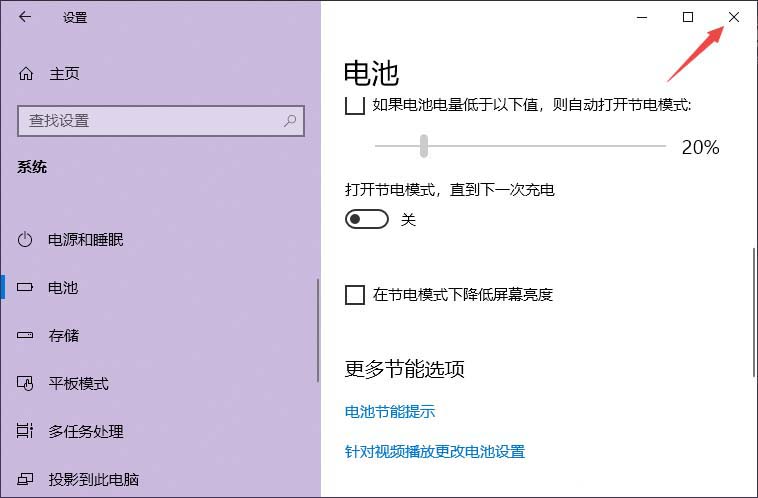 6、點(diǎn)擊取消掉后如圖所示,之后我們點(diǎn)擊關(guān)閉按鈕即可。這樣我們就關(guān)閉了在節(jié)電模式下降低屏幕亮度了。