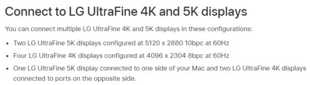 蘋果指出,為了最大程度地提高多個顯示器的性能,建議在MacBook Pro的不同側連接顯示器。此外,用戶還可將LG UltraFine顯示屏與新款16英寸MacBook Pro連接,具體包括: