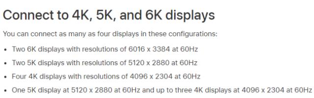 目前,蘋果官方支持文件顯示,新款16英寸MacBook Pro支持外接兩個6K顯示器(6016×3384分辨率,60Hz),具體包括: