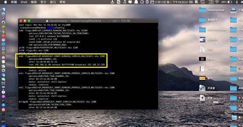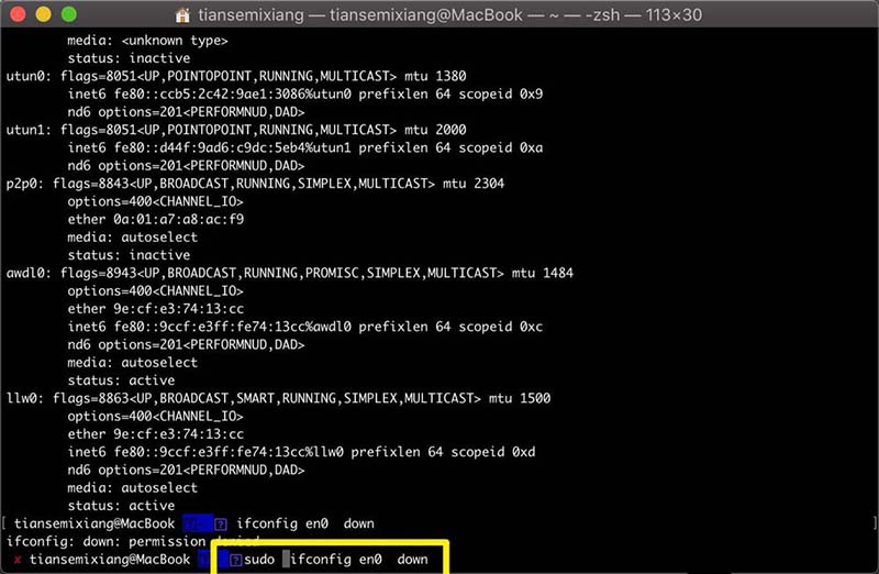 3、那么en開頭的就是網卡無線網卡名字,例如這里的en0,那么你要重啟網卡,輸入命令:【sudo ifconfig en0 down】