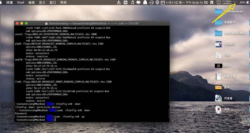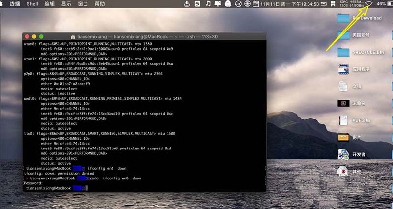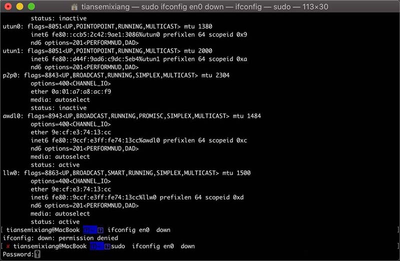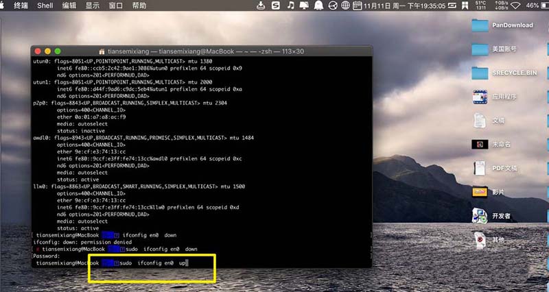 5、再次啟動無線網卡輸入命令:【sudo ifconfig en0 up】,那么回車,就可以啟動網卡。
