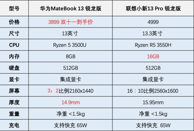 華為MateBook 13 銳龍版為R5 3500U,這款處理器在續(xù)航上有著不錯(cuò)的表現(xiàn),而聯(lián)想小新13 Pro為R5 3500H,性能上更強(qiáng)一些,但通過對(duì)比我們可以看到兩款處理器的主頻均為2.1GHz,睿頻為3.7GHz,所以性能差距幾乎可以忽略,而華為MateBook 13銳龍版的R5 3500U可以有著更好的續(xù)航以及更快的響應(yīng)速度。