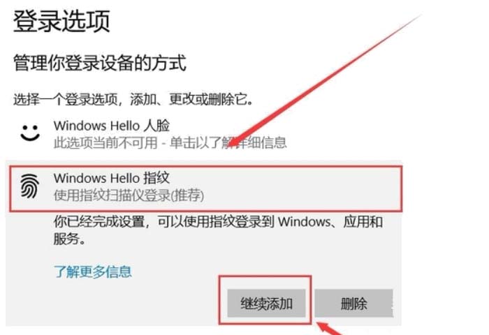 4.點(diǎn)擊Windows Hello 指紋,點(diǎn)擊添加指紋,如果已經(jīng)添加過(guò)的,想繼續(xù)添加其他指紋,點(diǎn)擊繼續(xù)添加。