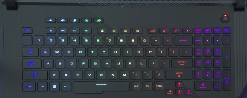 ROG槍神3 PLUS的鍵盤采用的是浮萍式的剪刀腳結構按鍵,按下去還能感受到一絲絲段落感,雖說沒有機械鍵盤那么強烈但是一般游戲時手感已經非常OK了。在左上方有幾個經常使用的多媒體按鍵比較使用,而且鍵盤帶有RGB背光,支持華碩的神光同步功能。