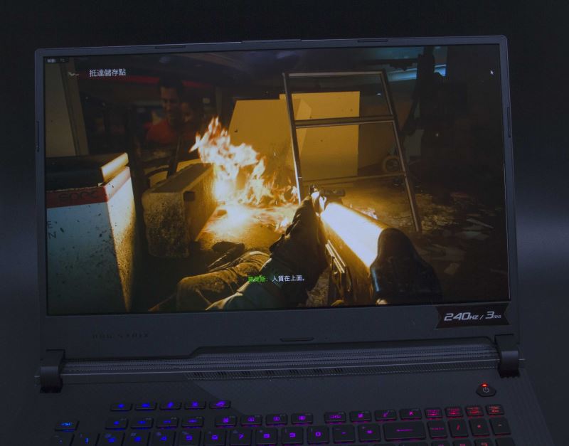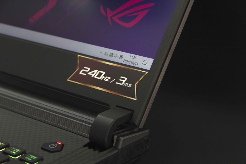 ROG槍神3 PLUS的屏幕采用了現在流行的窄邊框設計,三邊都是5.26mm,這比槍神2的邊框還要窄了1mm。這款屏幕素質也相當高,右下角的貼紙也表明:首先刷新率上達到了驚人的240Hz,這在目前游戲本中非常超前。同時ROG槍神3沒有使用讓人絕望的TN屏,而是使用了IPS屏幕,具備100% sRGB色域,3ms響應時間,可以稱得上是真正的專業電競屏。