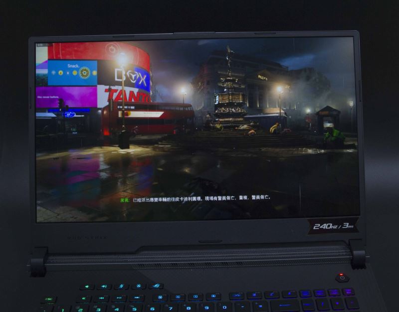 有了光線追蹤加持后游戲畫面更加真實,比如上圖是游戲第二章劇情,廣場上濕地面的反射就很逼真。ROG槍神3 PLUS游戲本屏幕素質本身也不錯,IPS屏幕對環境光的抗干擾能力更強,比如黑夜場景下暗部的畫面也很容易分辨,并且不同角度觀看都不會有顏色的損失。