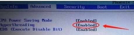 3、進入Advanced界面,找到Hyper-Threading功能,將默認的Enabled通過鍵盤上下鍵修改為Disabled。這樣就關閉了。