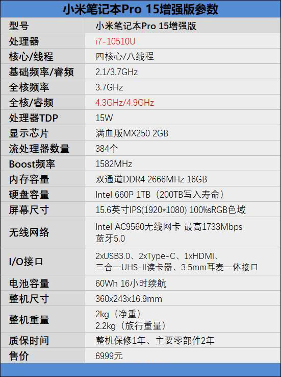 小米筆記本Pro 15增強版參數(shù)如下: