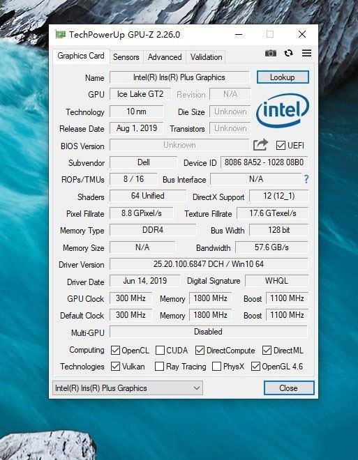 這一代XPS 13 2in1基于英特爾10代酷睿Ice Lake平臺打造,因此其圖形部分擁有Iris Plus核顯加持,這也是英特爾鼎力推出的Gen 11核顯。而且我所拿到的這款機型搭載了英特爾10代酷睿i7 1065G7處理器,其核顯為Gen 11系列最高規格的64EU版本,因此擁有堪比獨顯的圖形性能表現。