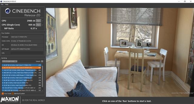 我們首先用CineBench進行了測試,CineBench是很有說服力的一套CPU和顯卡測試系統,最新的是R20版。相比R11.5版本的最多16個核心來說,R15版本最多能夠支持256個邏輯核心,此外新版本還加強了著色器、抗鋸齒、陰影、燈光以及反射模糊等的考察,對CPU性能的檢測更加準確。
