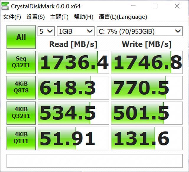 硬盤方面創物者Machcreator采用了一塊1TB 倍音速固態硬盤,從SSD CrystalDiskMark的測試成績來看,倍音速硬盤確實帶來了非常強悍的順序讀寫速度。