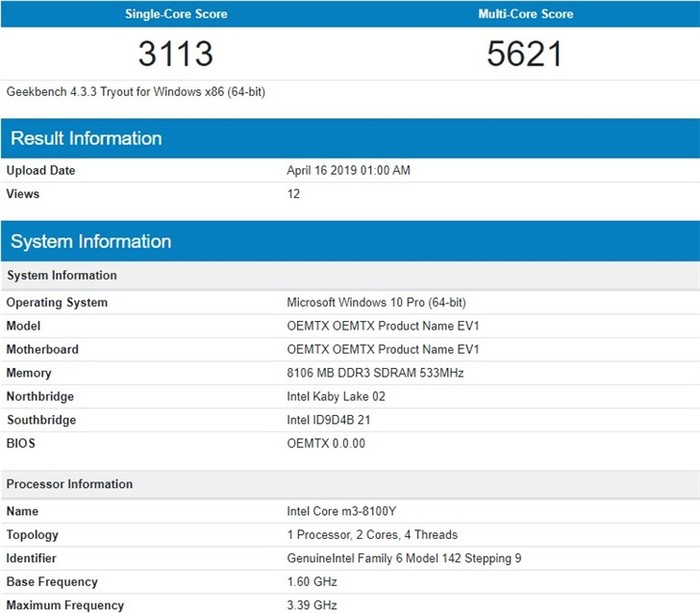此外,在Geekbench跑分網站上顯示,這款疑似Surface Go 2的產品擁有英特爾酷睿m3-8100Y處理器和8GB內存的配置,其處理器主頻最高3.39 GHz,單核得分為3113,多核得分為5621。