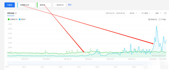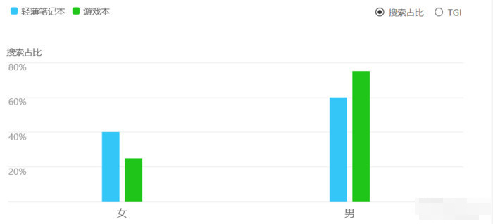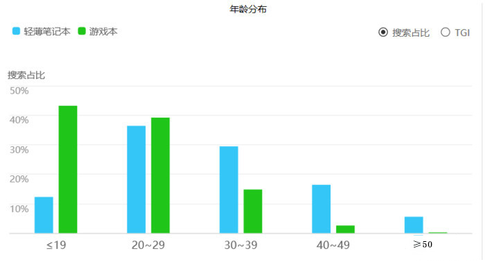 從百度搜索的人群畫像也能明顯看出,隨著年齡的增長,大家也更關注輕薄本。20歲之前,大家用筆記本都偏重于玩,所以游戲本的占比遠高于輕薄本。而二十歲之后,大家基本上陸續畢業并參加工作,所以對筆記本的需求更偏向于工作方面,日常上下班,外出出差,筆記本的輕薄自然不容忽視。
