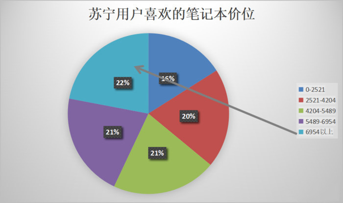 為了驗證這個猜想,我又去了蘇寧易購查看用戶比較偏愛的價位,發現了類似的結果。在蘇寧中78%的人偏愛選擇6954元以下的筆記本。