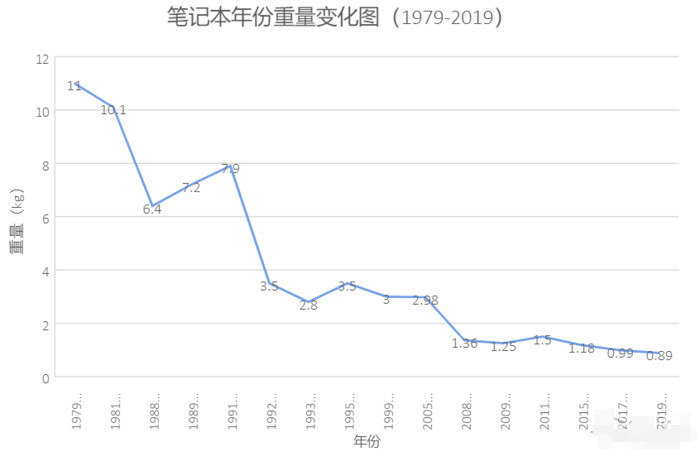 據不完全統計,各個年代代表性的筆記本重量變化,我們不難看出,輕薄是大勢所趨,人心所向。