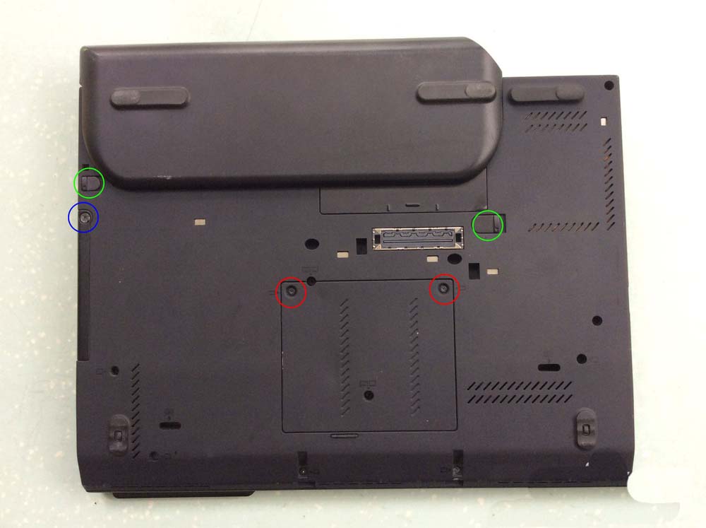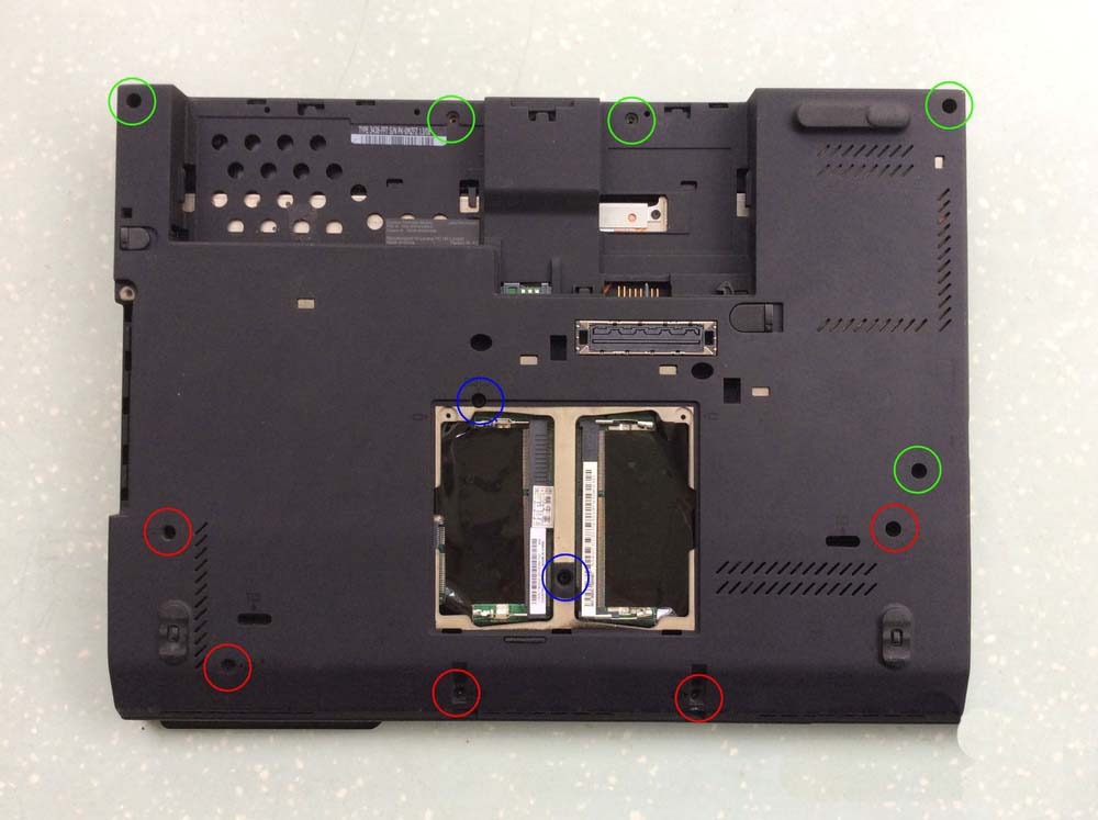 1、下圖綠色圈內開關往兩邊拔開卸下電池,拆掉藍色圈內螺絲卸下硬盤,拆掉紅色圈內螺絲拆下內存蓋,拔下內存。這一步就可以更換電池,內存和硬盤了。