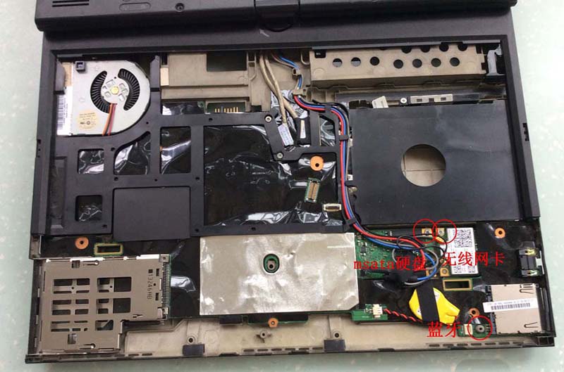4、拆到這里我們基本可以看電腦內部了,右下角分別為msata固態硬盤,無線網卡和藍牙,還有bios電池的位置,msata固態硬盤的位置也可以裝3G上網卡的,紅色和藍色線為3G天線,黑色和灰色線為無線網卡天線,拆掉紅圈內的螺絲,卸下msata硬盤,無線網卡和藍牙模塊。把四條天線理出來。