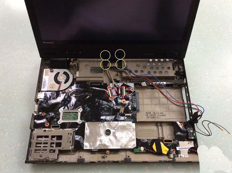 6、取下U框后就能看到主板了,拆掉下圖紅圈內的屏線,黃色圈內的四顆螺絲,這樣整個上半身就能拆下來了。