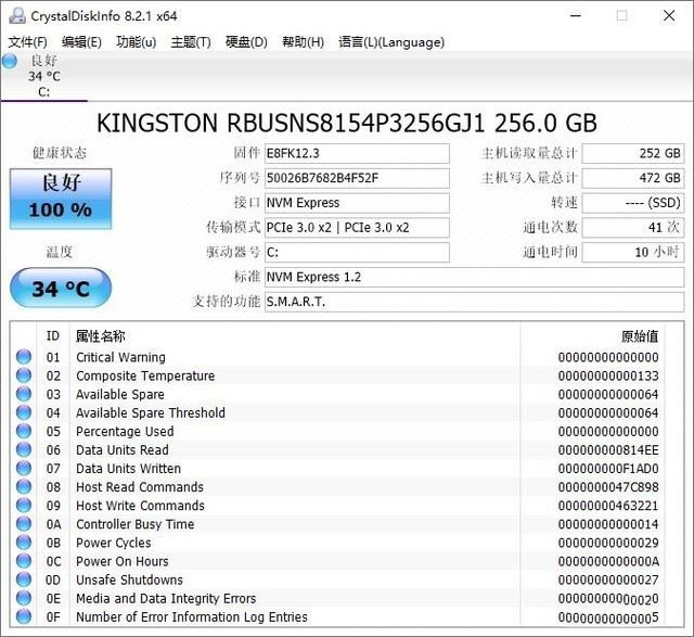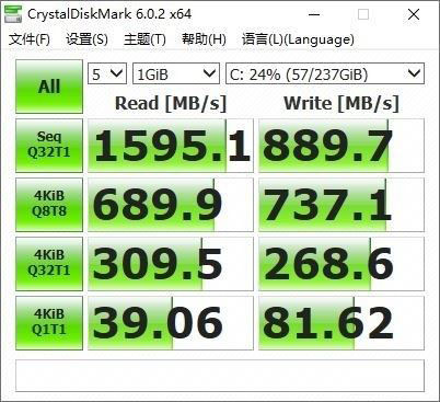 SSD來自金士頓,容量為256GB,走PCIe 3.0×2通道,CrystalDiskMark測試的順序讀寫速度分別是1595MB/s和890MB/s,隨機讀寫分別是39MB/s和82MB/s。