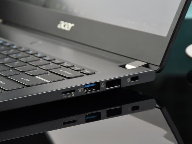 TravelMate P6配備了雷電3在內的多種接口,具體來看,機身左側有一個HDMI、一個USB 3.1 Gen 1(5Gb/s)、一個雷電3和一個3.5mm音頻接口。機身右側有一個Micro SD讀卡器、一個USB 3.1 Gen 1(5Gb/s,支持關機充電)、一個RJ45網口。視頻輸出、USB、SD卡、網口一應俱全。