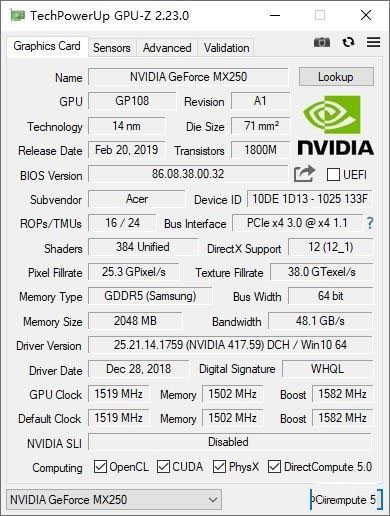 MX250是一顆入門級的獨立顯卡,它分為“滿血版”和“殘血版”,兩者的區別主要體現在功耗和頻率上,TravelMate P6上的這顆MX250為“滿血版”,性能可以滿足工作之余打打網游的需求。