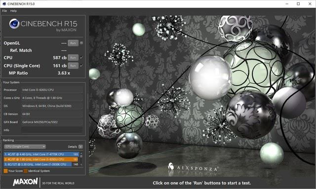 i5-8265U是一顆4核心8線程的低電壓處理器,也是目前輕薄筆記本中i5級別的主力型號,基于英特爾最新的酷睿Whiskey Lake架構,性能方面我們以Cinebench R15為例,這顆i5-8265U的單、多核分數分別是161和587cb,單核分數表現正常,多核分數稍低一些。
