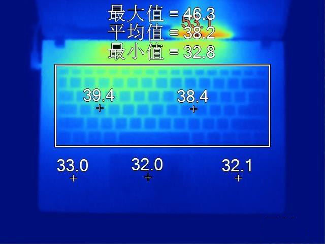 C面溫度方面,可以看到鍵盤區域幾乎沒什么熱量,僅有左上部溫度稍高一些,對應內部結構應該是CPU和供電部分,觸控板和掌托部分就非常涼爽了。