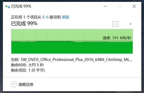 大多數(shù)情況下,日常辦公時(shí)傳輸?shù)奈募?shí)際上并不會(huì)很大。我們實(shí)測(cè)一個(gè)1.04GB的文件進(jìn)行復(fù)制,可以看到其傳輸?shù)乃俣冗_(dá)到了191MB/s,并且復(fù)制完成僅用了5秒的時(shí)間,速度快而穩(wěn)定。