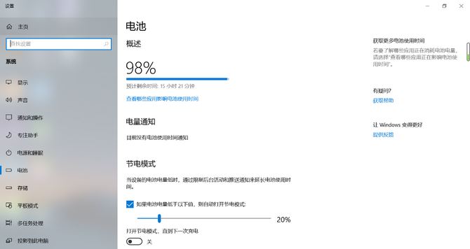這款筆記本內(nèi)置45Wh鋰離子電池, 并且支持65W適配器快速充電 (30分鐘充電到50%, 2小時(shí)充電到100%)。在滿電情況下,筆記本節(jié)進(jìn)入節(jié)電狀態(tài),此時(shí)可以看到其續(xù)航時(shí)間預(yù)計(jì)為15小時(shí),即便是滿負(fù)荷工作,無電源狀況下,應(yīng)對(duì)一天的工作也毫無壓力。