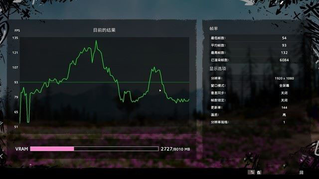 第一款游戲為《孤島驚魂:新曙光》,測試畫質為高、1080P、關閉垂直同步,最終得到平均93幀的成績。該成績屬于RTX2080 Max-Q的正常表現,可見Alienware m17發揮出了RTX2080 Max-Q的性能。