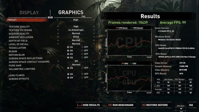 第二款游戲為《古墓麗影:暗影》,測試畫質為高、1080P、DX12、關閉垂直同步,最終得到平均99幀的成績,該成績同樣屬于RTX2080 Max-Q的正常表現,Alienware m17的性能釋放值得肯定。