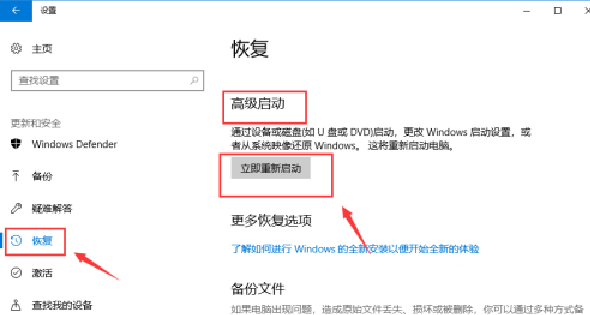 3、點擊 恢復 選項,在右側 找到 立即重新啟動 按鈕,點擊;