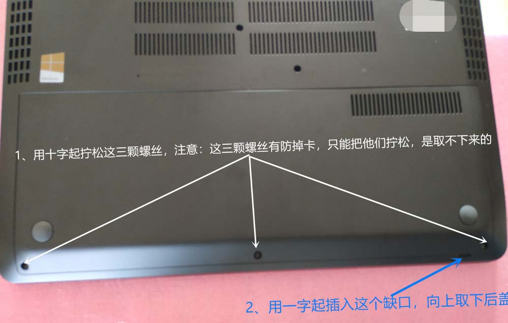 1、聯想Thinkpad s5處于關機狀態下,拔下外接電源,屏朝下,底殼朝上,平放在桌面上。先用十字起擰松后蓋的三顆螺絲,再用一字起伸入缺口里,向上取下后蓋。