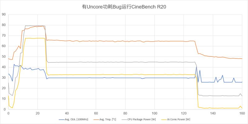 之前說到,這臺雷蛇靈刃15水銀版不巧遇到了Uncore功耗Bug。所謂Uncore功耗Bug,就是CPU的功耗傳感器錯誤地計算了Uncore消耗的功耗,由于TDP限制,整個CPU的總功耗是有限的,導致CPU實際參與計算的核心分到的功耗變少,這會導致性能下降。這也是為什么這臺機器的CPU已經降壓了100mV,Cinebench分數卻跟其他未降壓的i7-9750H差不多。