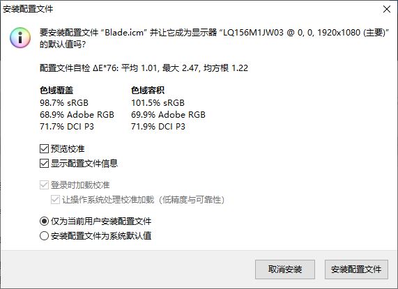 雷蛇靈刃15水銀版屏幕本身的素質就不錯,出廠更是經過了預先校色,可以在設置中看到這個名為blade的色彩配置文件。我們使用DisplayCal軟件查看這一配置文件的具體信息,得到以下結果: