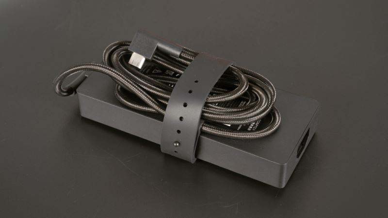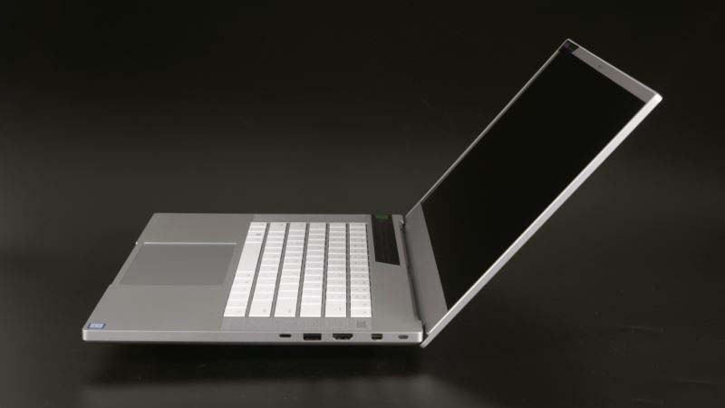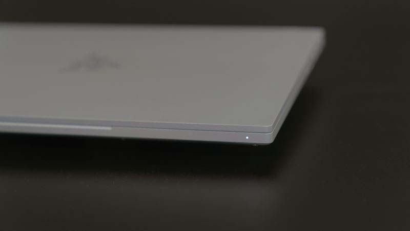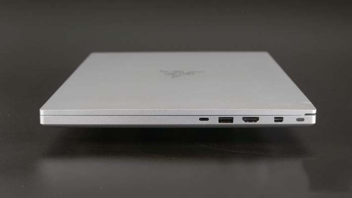 由于采用了下沉式轉軸,后面便無法安排接口。左側的接口依次為電源接口、兩個USB 3.2 Gen 2接口,耳麥接口。右側依次為雷電3接口、USB 3.2 Gen 2接口、HDMI 2.0b視頻輸出接口、mini-DP 1.4視頻輸出接口、防盜鎖扣。因為機身過于輕薄,并沒有網線接口,有需求的人需要自備一個轉接器。