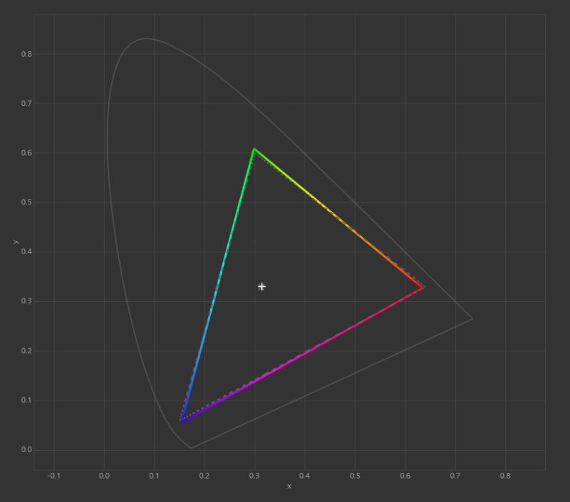 色域容積為101.5% sRGB,覆蓋率達到了98.7% sRGB,可以說是很優秀了,色域三角形跟標準基本無異,白點也很準確。我們使用愛色麗i1 Display Pro對屏幕進行測量,然后再次校色,結果如下: