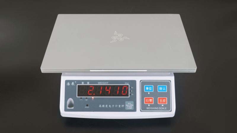 盡管全身采用了金屬材料,雷蛇靈刃15水銀版仍然將重量控制在了2.14千克,加上適配器和電線總重2.91千克。