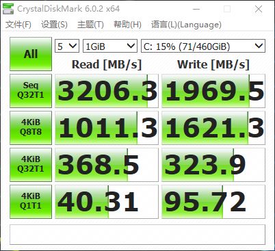 使用CrystalDiskMark實測下來連續讀取速度超過了3200MB/s,連續寫入超過了1900MB/s,都超過了標稱值。而在進行32GB測試中,寫入速度出現了大幅下降,這是因為耗盡了SLC緩存造成的。