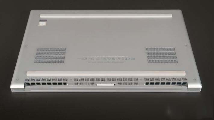 機器下方是一塊長條的80瓦時電池,提供了不錯的續航。上方的兩個內存插槽都已安裝8GB的內存,組成雙通道16GB。內存左側是M.2 SSD,似乎整個機器只有這一條插槽,無法進一步擴展。右側是英特爾的AX-200網卡。由于這款筆記本揚聲器是朝上發聲,因此從背面只能看到兩邊兩塊塑料,看不到音箱單元本身。