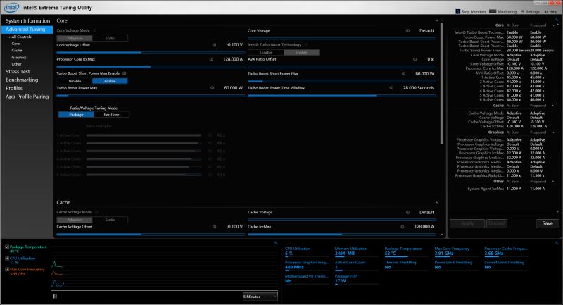 在烤機前,先說明一下這臺雷蛇靈刃15水銀版的CPU電壓被預先降低了100mV,因此同樣的功耗下能達到更高的頻率。