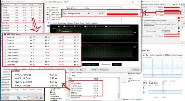 我使用AIDA 64和Furmark對其進(jìn)行了CPU+GPU雙拷機(jī)測試,處理器核心溫度基本在65℃左右,顯卡溫度63℃,表現(xiàn)不錯。不過從功耗和頻率來看,ENVY 13的調(diào)校有一些保守,存在降頻現(xiàn)象,峰值功耗在10W左右,經(jīng)過一段時間拷機(jī)之后會降到6W左右。